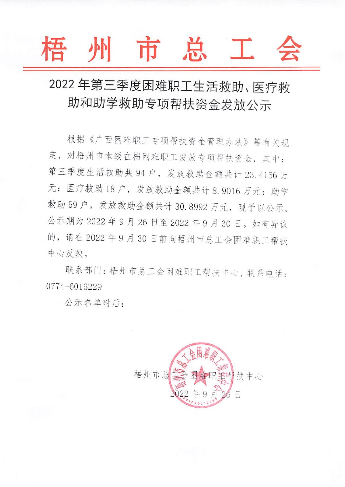 2022年第三季度困難職工生活救助、醫(yī)療救助和助學救助專項幫扶資金發(fā)放公示