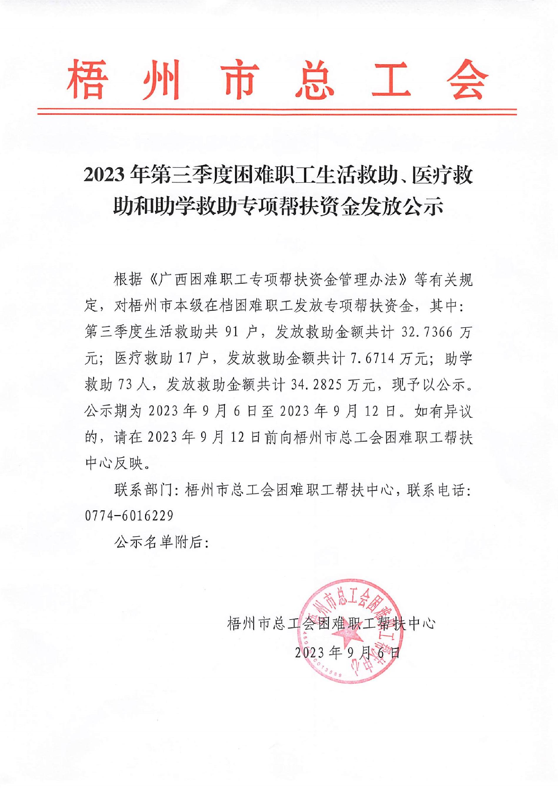 2023年第三季度困難職工生活救助、醫(yī)療救助和助學(xué)救助專項幫扶資金發(fā)放公示