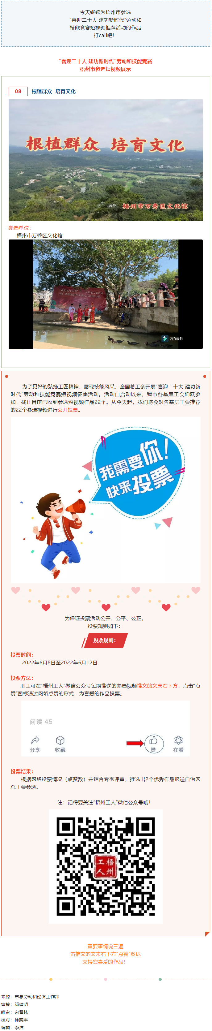 梧州市萬秀區(qū)文化館參選作品丨“喜迎二十大 建功新時代” 勞動和技能競賽短視頻投票活動開始啦!