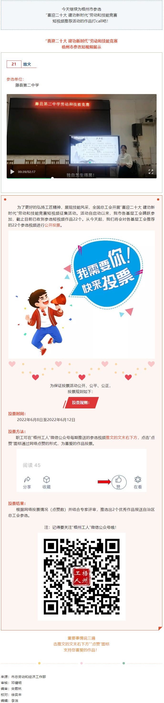 藤縣第二中學參選作品丨“喜迎二十大 建功新時代” 勞動和技能競賽短視頻投票活動開始啦!