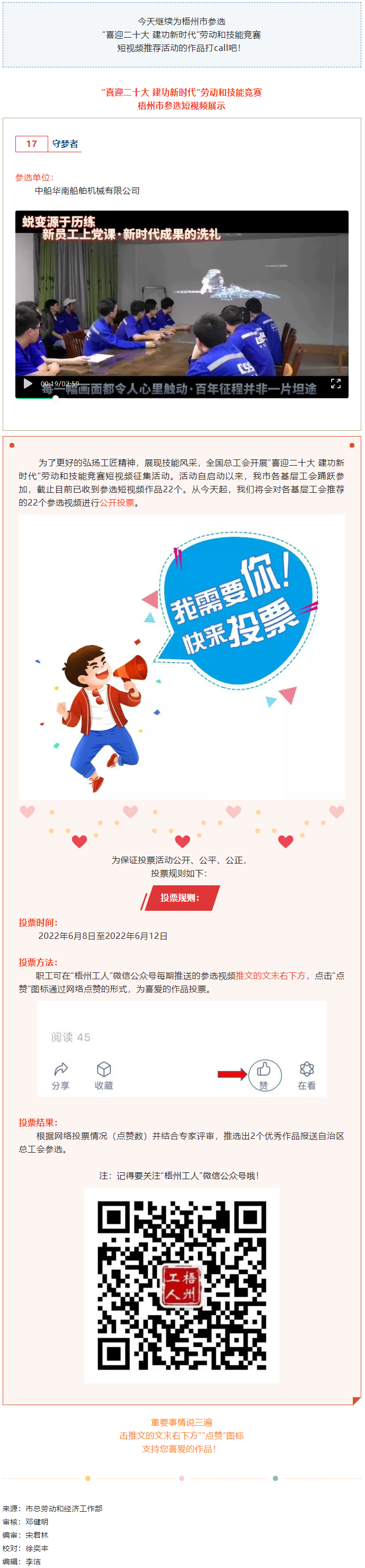 中船華南船舶機(jī)械有限公司參選作品(一)丨“喜迎二十大 建功新時(shí)代” 勞動(dòng)和技能競(jìng)賽短視頻投票活動(dòng)開(kāi)始啦!